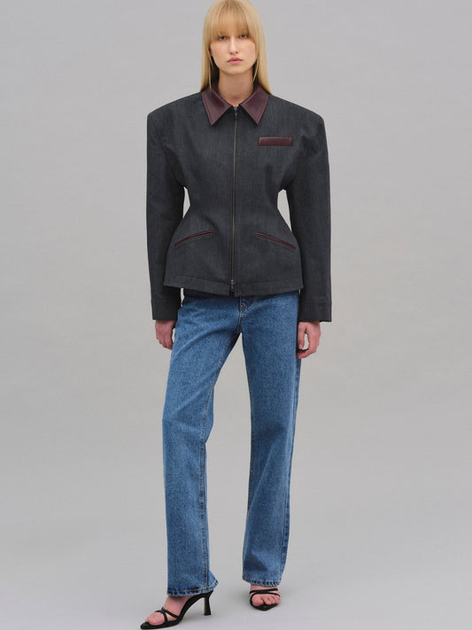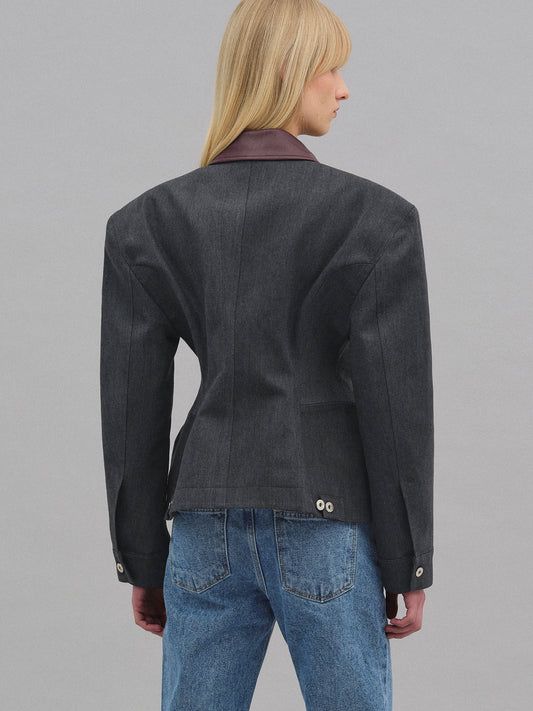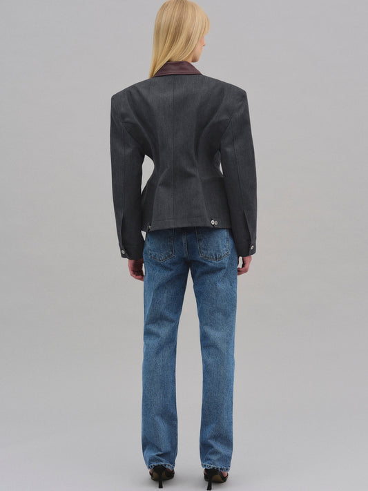 Kum saati silüetine sahip, dolgulu omuzları ve kontrast deri yakasıyla öne çıkan, yapılandırılmış bir iş ceketi. Belini ayarlamak için arkada düğmeli şeritler bulunur. Tamamen astarlıdır.